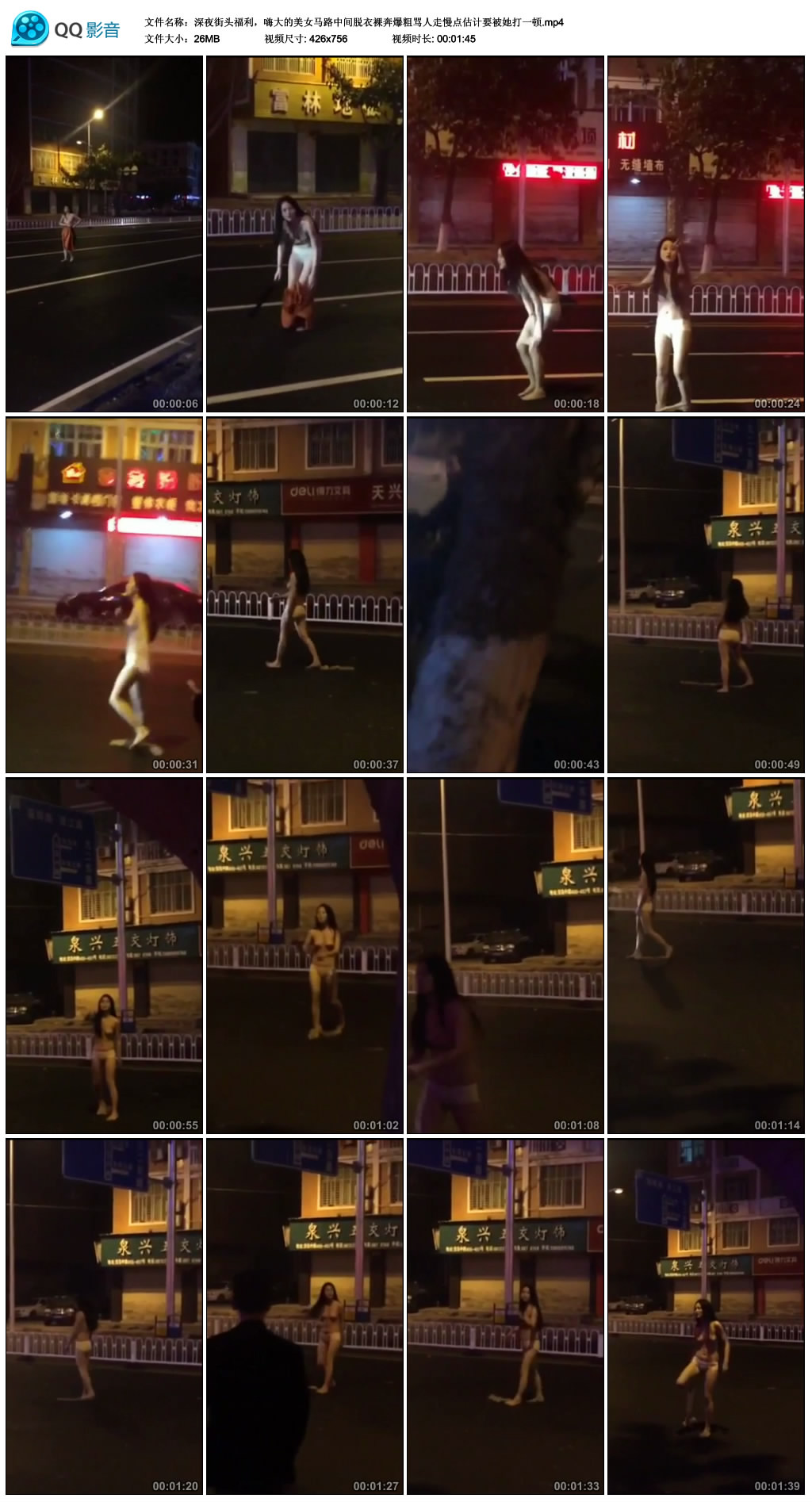 【影片名称】:深夜街头福利,嗨大的美女马路中间脱衣裸奔爆粗骂人