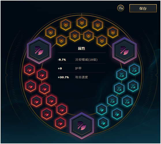 一套非常极端的符文。在这里,因为是打野,绝大多数时间都不会承受魔法伤害,所以我蓝色选择了攻速以及成长CD,以增加清野速度,同时配合出装可以达到满CD。如果没有这么多攻速符文,红色可以带一点攻击力,蓝色也可以配上魔抗,但CD尽量配齐。