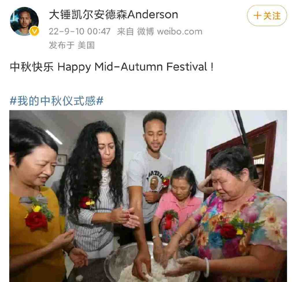 近日,NBA球员安德森连续发布社交媒体,晒出两张之前在中国拍的照片,一个动态配文是:我和我太太都很喜欢吃龙眼,另一个是祝大家中秋快乐。